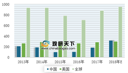 2013-2018年E全球、美國與中國工程機(jī)械市場規(guī)模對比(單位:億美元)